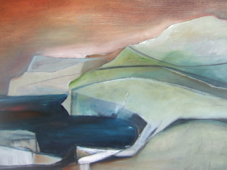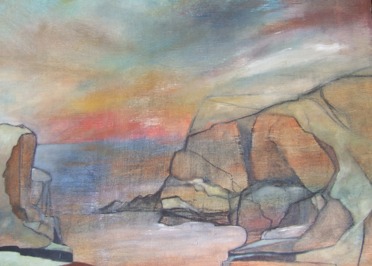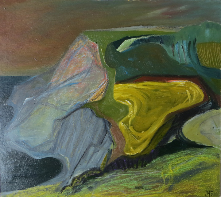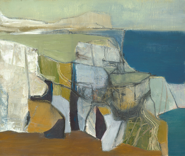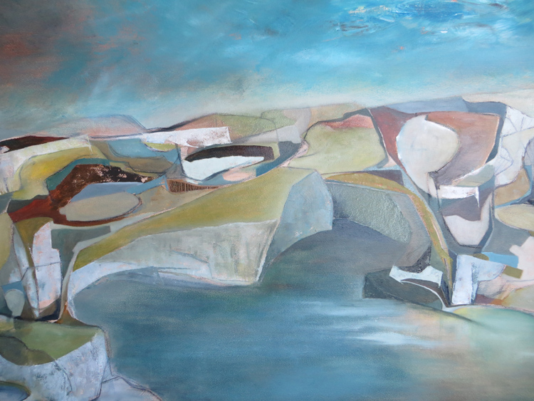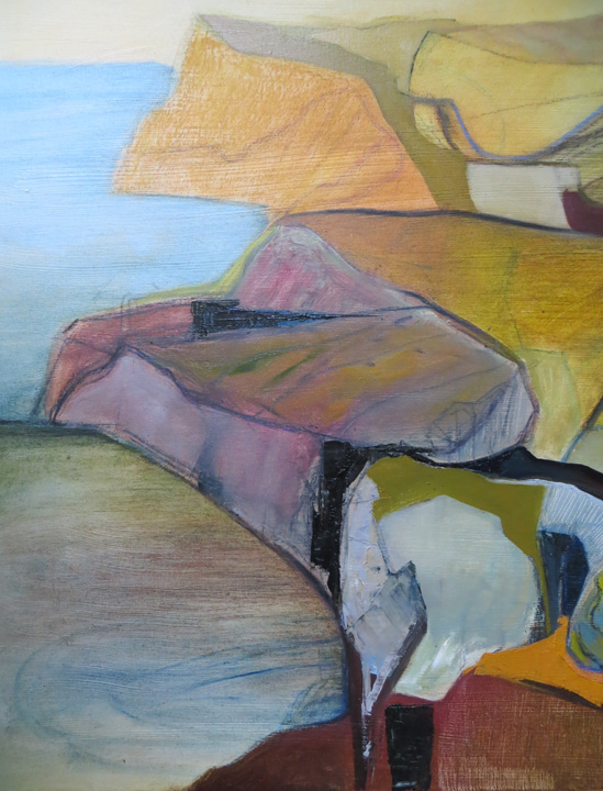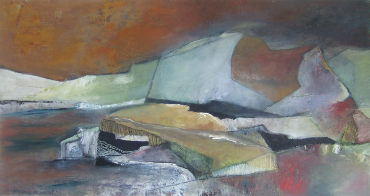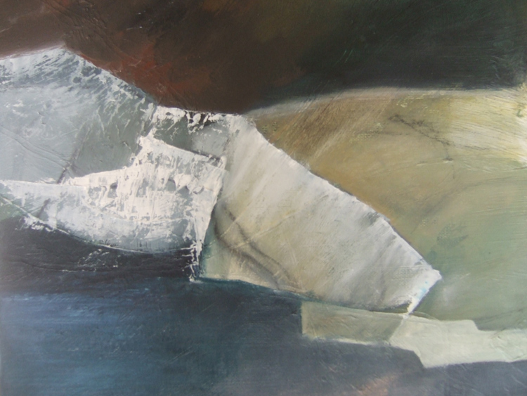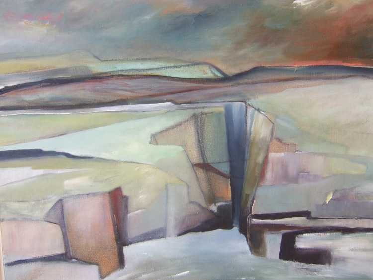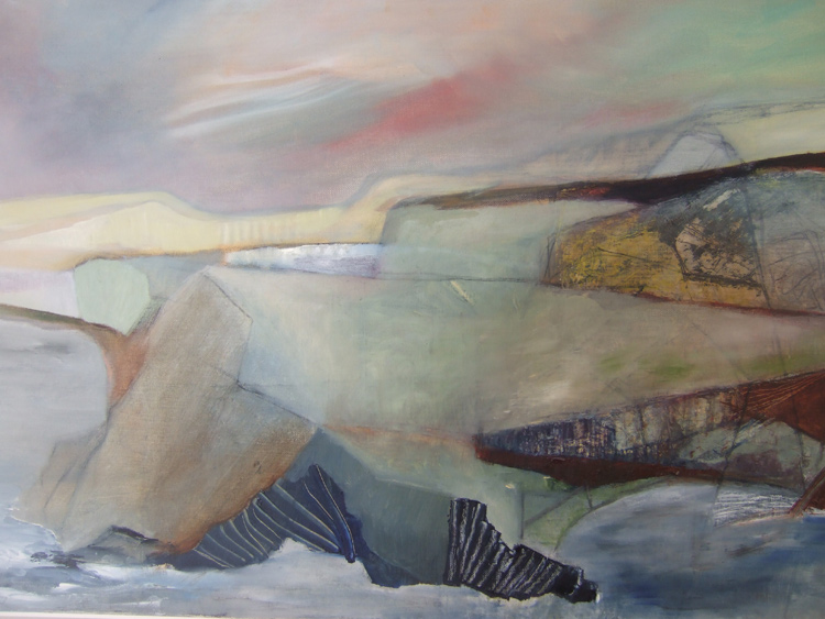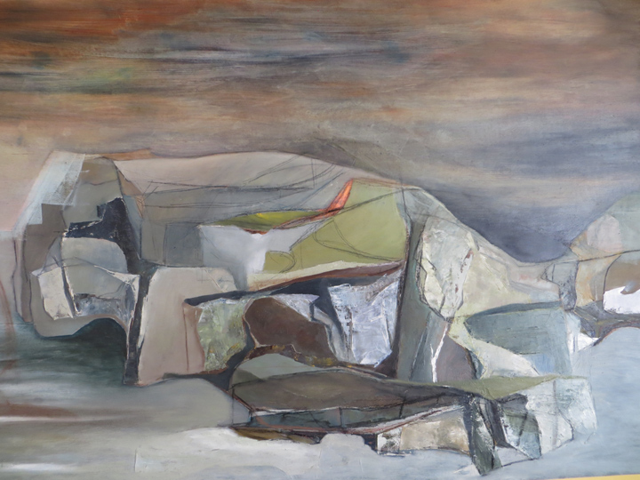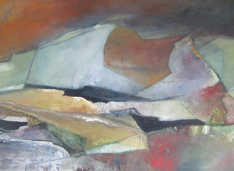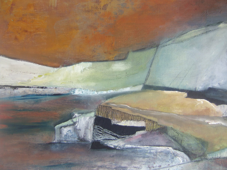 The evocative rock and stone of Purbeck, the moods of nature through unpredictable weather changes all play a vital part in how Heather approaches her work. Her visual interpretations of the ancient quarried rock formations captivate the imagination! – the shapes and lines interacting to create a certain rhythm with harmony of colour.