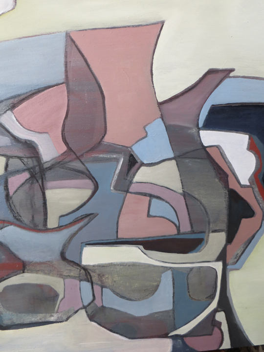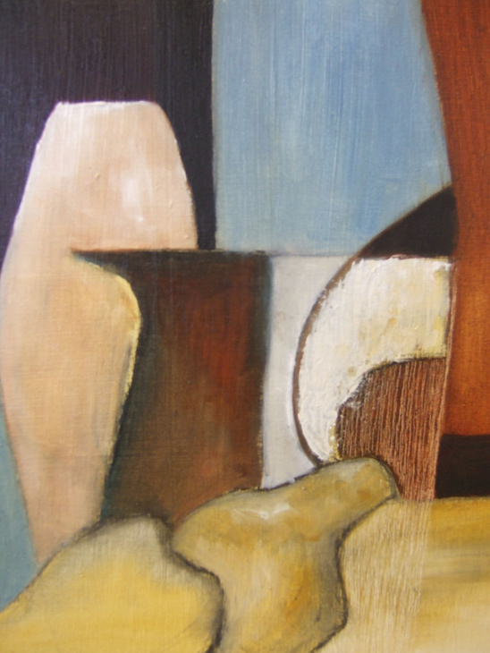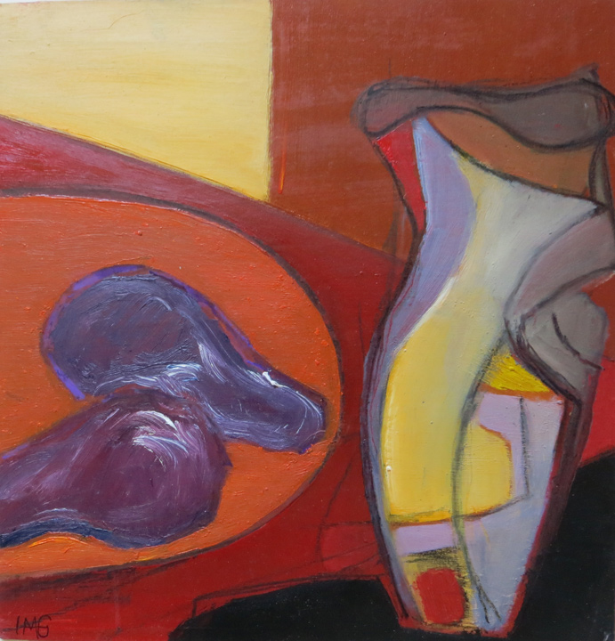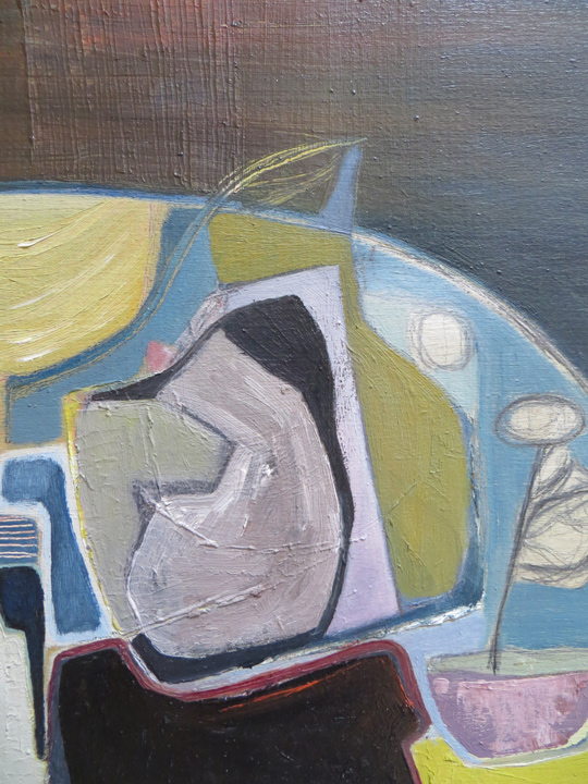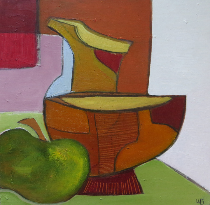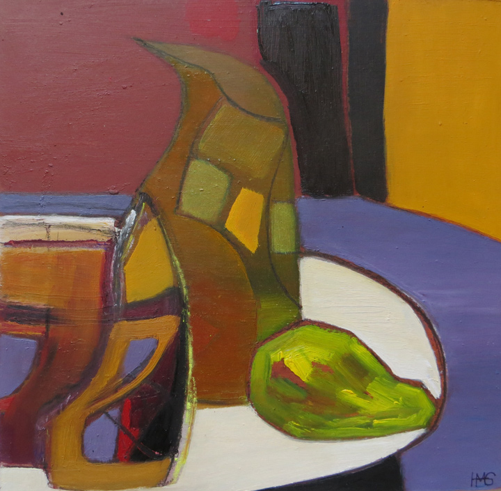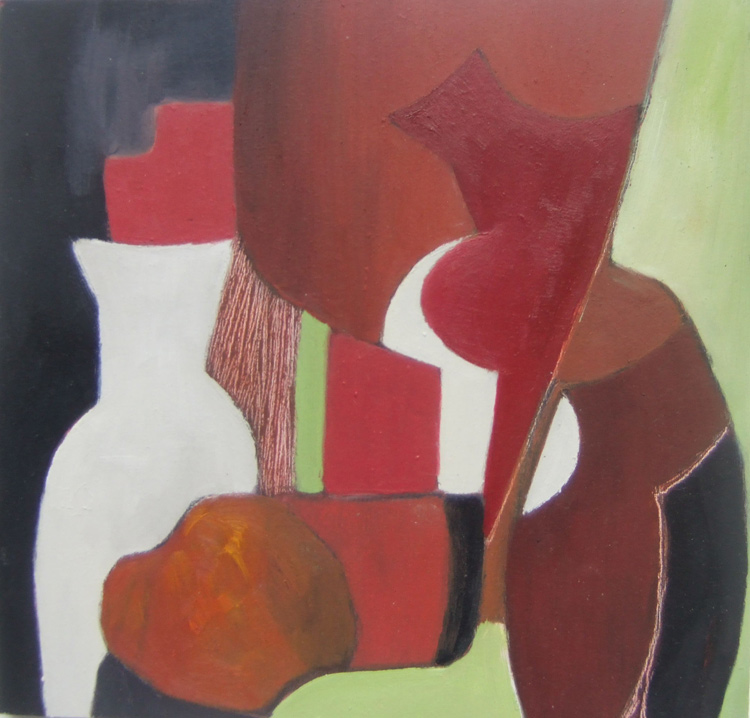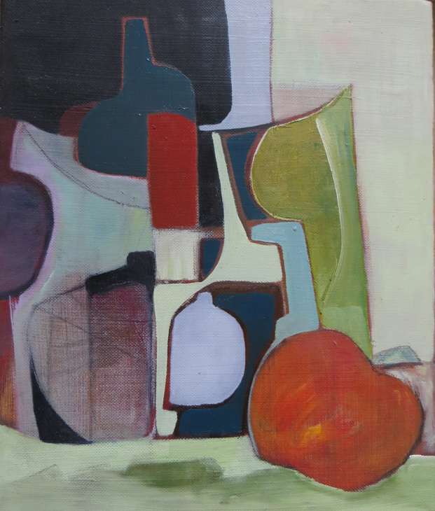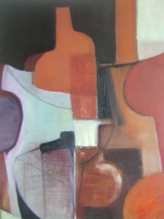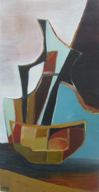 As with her other work, Heather is not concerned in producing a replica of the actual subject matter – her interest lies in the manipulation of the “seen” shapes, the exaggerated line used to enhance a particular curve on a bottle or bowl – sometimes moving a certain object into another position to make it link with another compatible shape ..playing with the geometrics is her explanation!